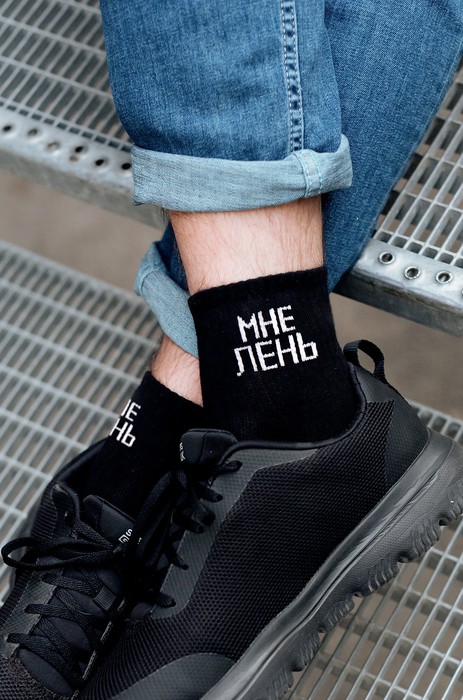 Черные мужские носки с прикольной надписью Мне лень точно поднимут настроение и разбавят повседневные будни! Демисезонная модель средней длины выполнена из смесового трикотажа: хлопок с добавлением эластана для лучшей посадки по ноге.