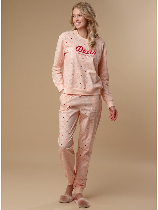 Пижама женская 3279TCC бренда Indefini, изготовленная из мягкого хлопка, включает кофту с длинными рукавами, с круглым вырезом и с резинкой снизу и на манжетах.