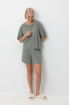 Пижама женская изготовлена из полиэстера с добавлением хлопка и вискозы. В комплекте майка с шортами. Майка на тонких регулируемых бретелях имеет декоративный элемент в зоне декольте. Шорты с аналогичным декоративным элементом держатся на талии тонкой эластичной резинкой.