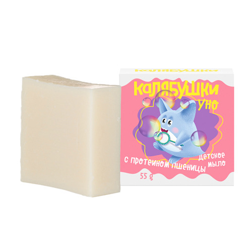 Детское мыло "Калябушки" с протеином пшеницы деликатно очищает детскую кожу с головы до кончиков пальцев.