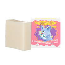 Детское мыло "Калябушки" не содержит продуктов животного происхождения и может быть использовано всеми членами семьи и для очищения кожи, и для застирывания одежды.