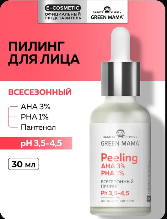 Пилинг для лица GREEN MAMA эффективный уход, направленный на мягкое обновление кожи без агрессии и шелушения. Оптимальное сочетание фруктовых и молекулярных кислот способствует деликатному очищению поверхности кожи, стимулирует процессы регенерации, выравнивает микрорельеф и осветляет пигментацию.