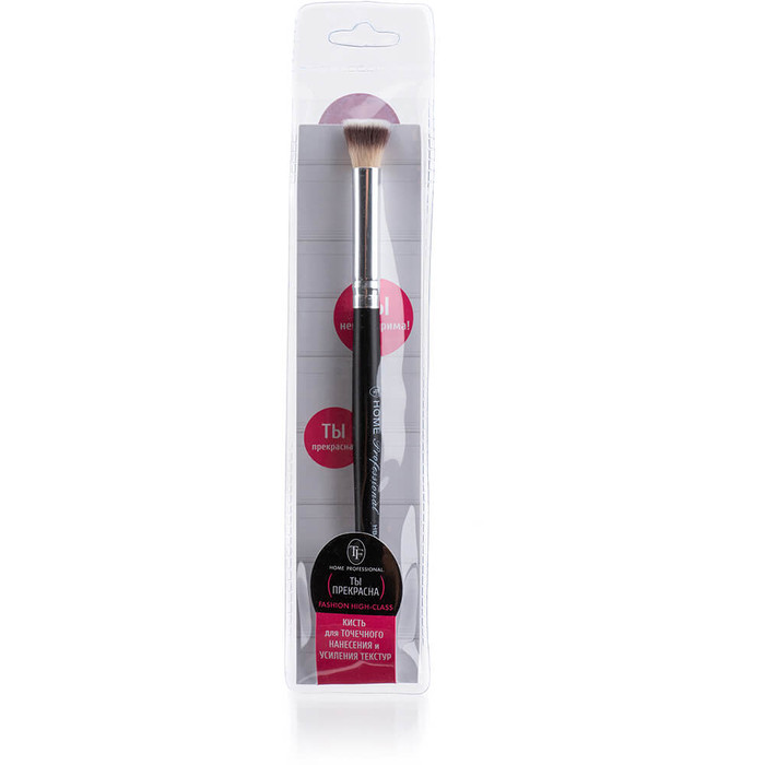 Пушистая, с круглым срезанным сечением, используется для невесомого и легкого нанесения в технике «вбивания» пудры, кремовых и сухих румян, тонального крема, бронзатора. Она позволяет создавать точечные эффекты, моделировать текстуру кожи и усиливать текстуры. Кисть имеет мягкий синтетический ворс.