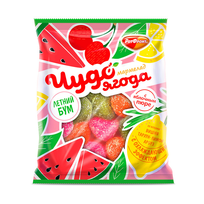 Аппетитные полукруглые мармеладки «Чудо-Ягода» от фабрики «Рот Фронт» – настоящее летнее удовольствие с охлаждающим эффектом. Созданный на основе натурального яблочного пюре, он сохраняет натуральную освежающую нотку во вкусах вишни, тархун-лимон и арбуз. Шероховатая сахарная посыпка оттеняет вкус мармелада, как крошечные кубики сладкого льда. Сказочное лакомство для любителей мармелада и желе.