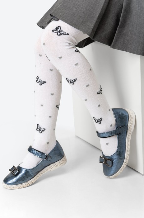 Детские белые колготки для девочки выполнены из хлопка с полиамидом и эластаном. Элегантный принт с бабочками добавляет образу лёгкости и романтичности.