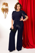 Комбинезон женский отрезной по линии талии, со спущенной линией плеча понизу с отделочной тесьмой «бахрама», с притачным поясом и съёмным завязывающимся поясом по линии талии. С застёжкой по среднему шву спинки на потайную молнию. Лиф переда на запах. Лиф спинки с талевыми выточками. Брюки расширенного силуэта, передние части с косыми боковыми карманами, задние с талевыми выточками.
