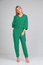 Комбинезон с центральной двубортной застежкой на петли и пуговицы, отложным воротником и лацканами. По переду- рельефы, выходящие из проймы. Спинка с талиевыми вытачками. Рукав втачной, короткий. Нижняя часть комбинезона с карманами, вход в карман наклонный к боковому шву. Комбинезон со съемным поясом.