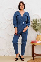 Комбинезон с центральной застежкой на потайную молнию в среднем шве спинки, без воротника, с V-образным вырезом горловины. В боковых швах расположены карманы. Комбинезон без рукавов, со спущенным плечом, разрезом по плечевому шву. Комбинезон отрезной по линии талии, шов по талии присборен на резинку. Комбинезон со съемным поясом.