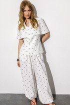 Комплект из легкой костюмной ткани.Жакет свободного силуэта с цельнокроеными рукавами, центральной застежкой на одну пуговицу и удобными функциональными карманами по переду.Воротник отложной с лацканами.Брюки свободного прямого силуэта с высокой посадкой и эластичной резиной по поясу.