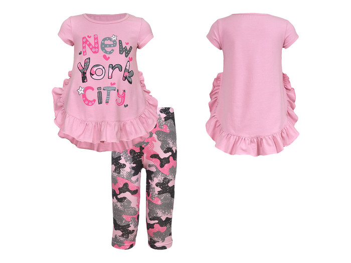 Комплект для девочки.Кулирное полотно: 95% х/б, 5%лайкра.Джемпер-силуэт трапеция,короткий рукав.Перед с печатью и вышивкой.Рюша по низу от боковых швов,спинка удлиненная.Горловина окантована.Лосины-укороченные на резинке.