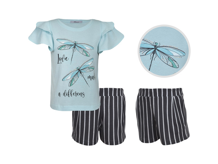 Комплект для девочки.Кулирное полотно: 100% х/б.Фуфайка-прямая,короткий рукав из двух воланов.Горловина окантована,низ подшит.Печать на переде и стразы.Шорты-короткие,два боковых кармана,пояс с резинкой.