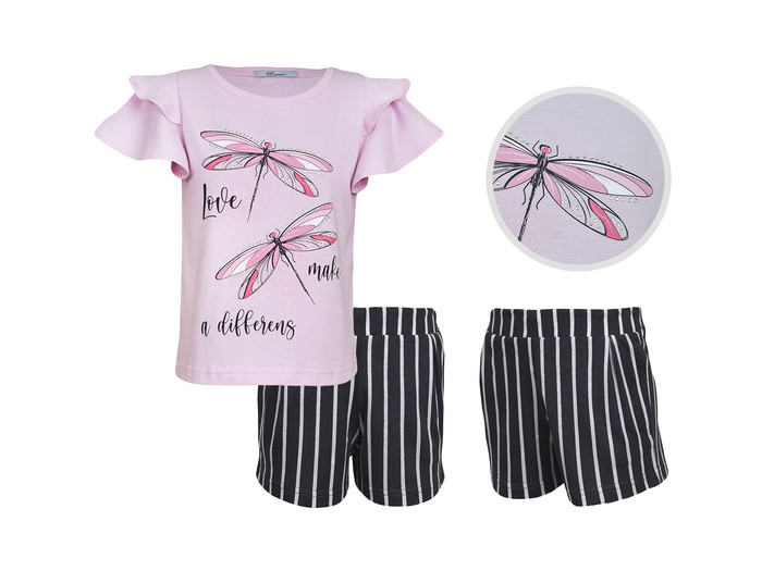 Комплект для девочки.Кулирное полотно: 100% х/б.Фуфайка-прямая,короткий рукав из двух воланов.Горловина окантована,низ подшит.Печать на переде и стразы.Шорты-короткие,два боковых кармана,пояс с резинкой.