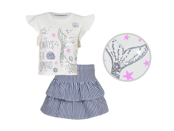 Комплект для девочки.Кулирное полотно: 100% х/б.Фуфайка-полуприлегающий силуэт,перед с печатью и вышивкой-пайетки.Короткий рукав-волан,горловина обработана планкой.Юбка на кокетке с резинкой и двумя рюшами.