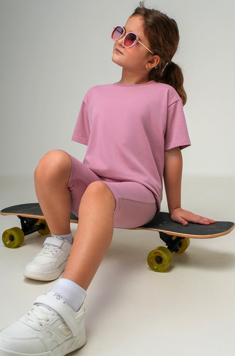 Летний костюм для девочки и девочки-подростка представлен в очаровательном пудровом оттенке.