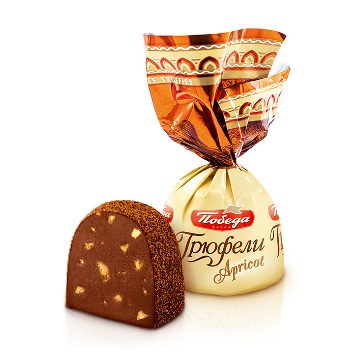 Классические трюфели «Победа» созданы по традиционному рецепту. Нежное «сердце» из сливок и шоколада (ганаш) усыпано ароматным темным какао. В этом рецепте добавлены кусочки абрикоса, которые создают изящный вкусовой альянс фруктовой кислинки в обрамлении терпкого шоколада.