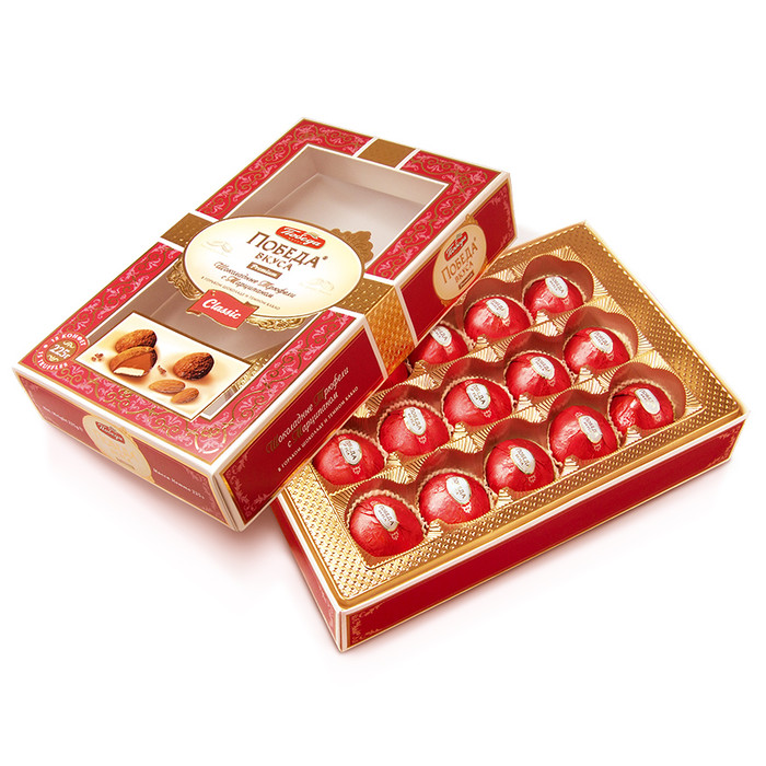 Трюфели с марципаном – оригинальный рецепт фабрики «Победа». В его основе сочетание классического сливочно-шоколадного «трюфельного сердца» с прослойкой из марципана – тертого миндального ореха.