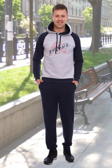 Мужской костюм толстовка и брюки. Толстовка с капюшоном и рукава реглан. На полочке присутствует принт, манжеты и пояс из кашкорсе. Брюки с карманами и манжетами из кашкорсе.