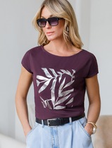 Костюм женский из кулирного полотна состоит из футболки и брюк. Футболка прямого силуэта, горловина круглая, обработана окантовкой, спущенное плечо, рукав короткий втачной, по низу изделия кулиска со шнуром, на полочке принт. Брюки прямые, верх на поясе с резинкой, в боковых швах внутренние карманы, низ изделия на резинке.