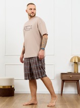 Костюм мужской футболка с шортами. Футболка прямого силуэта, рукав втачной, на верхнюю часть рукава настрочена репсовая тесьма с буквами. На полочке стильный принт. Шорты прямые, немного ниже колена, с боковыми внутренними карманами
