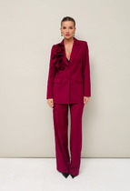 Костюм состоит из куртки на молнии и брюк. Брюки прилегающие, на эластичном поясе, на манжете, с лампасами из отделочного полотна. Куртка прямого силуэта, со спущенным плечом, с фигурной горловиной и линией низа. Рукав длинный, на манжете. На полочке расположен фигурный карман с обтачками из отделочного полотна.