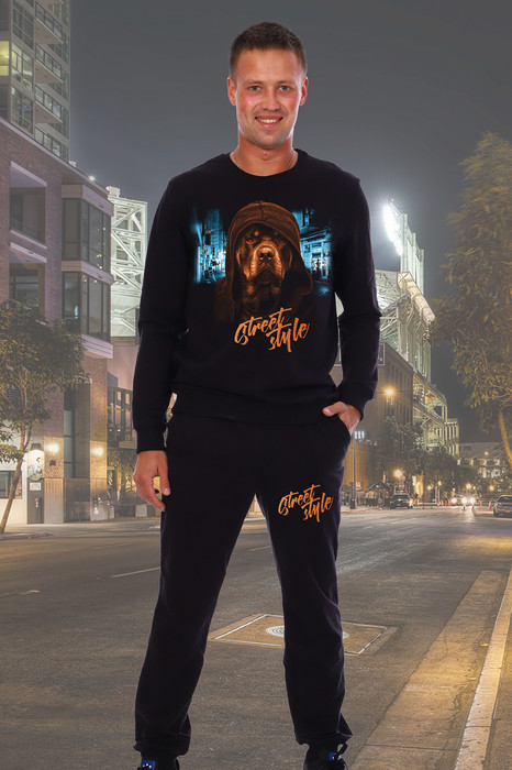 Костюм мужской свободного силуэта, состоит из джемпера и брюк. На полочке и брюках – принт. Рукава и брюки на манжете. На брюках боковые карманы. По входу в карман, горловине, поясу джемпера – кашкорсе.