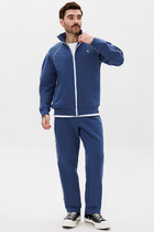 Костюм мужской выполнен из утепленного футера 3-х нитки с начесом. Кофта на молнии с капюшоном и карманами на молнии. Слева на груди небольшой печатный принт. Брюки с карманами на манжетах. Слева под карманом небольшой печатный принт.