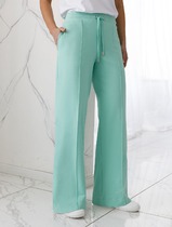 Комплект состоит из кофты и брюк. Кофта свободного силуэта, с округлой горловиной, по рукавам и по низу кофты - широкие манжеты. Брюки прямые, на поясе, с карманами, снизу манжеты в цвет ткани. Обработка карманов у брюк - отстрочка 0,5 см.