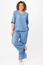 Костюм женский из кулирки, состоит из шорт и кофты. Кофта прямая, горловина круглая, окантована, рукав короткий втачной. На полочке печать - кошка, низ обработан швом в подгибку на плоскошовной машине. Шорты свободные, верх на поясе с резинкой, в боковых швах вставки из основной ткани, окантованы.