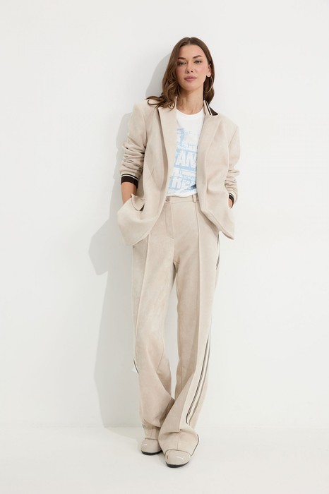 Описание Костюм состоящий из жакета и брюк. Жакет прямого силуэта из трикотажного полотна “замша”. Воротник пиджачного типа, верхняя часть воротника из отделочной ткани. По центру застежка на петлю и пуговицу. Рукав одношовный втачной, по низу манжета из трикотажного полотна. По переду функциональные карманы с накладными клапанами. По низу жакета притачной пояс (из трикотажного полотна). Жакет на подкладке. Обращаем ваше внимание, что фурнитура может отличаться от фото. Брюки прямого силуэта из трикотажного полотна “замша”. По верху притачной пояс с застежкой на петлю и пуговицу и шлевками для ремня. На передних половинках обработаны карманы, канты и застежка молния в среднем шве, на задних – вытачки. По поясу задних половинок брюк эластичная тесьма(резинка) . Вдоль бокового шва брюк лампас. Обращаем ваше внимание, что фурнитура может отличаться от фото. Декоративный элемент - цепочка в комплектацию не входит.