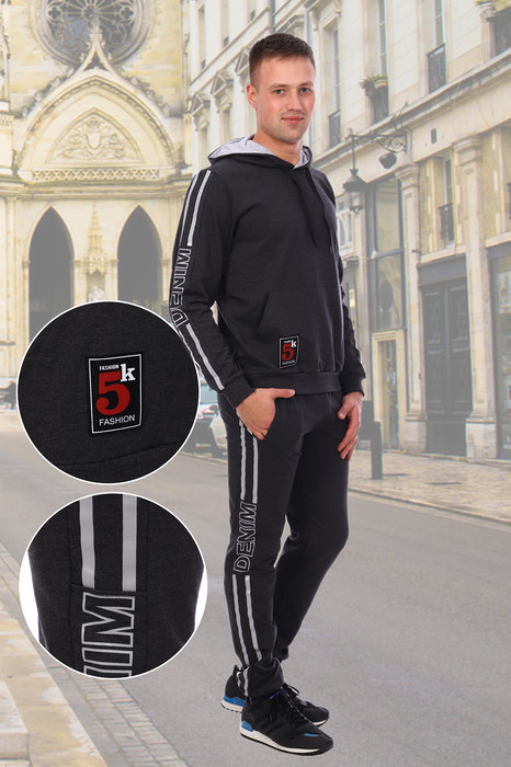 Мужской костюм из 2-х нитки с лайкрой. Толстовка с капюшоном, пояс из кашкорсе, карманы "кенгуру". На рукавах вставки с печатью. Брюки на манжетах, два кармана с листочкой. По боковым швам вставки с печатью. Пояс из кашкорсе с резинкой и шнурком.