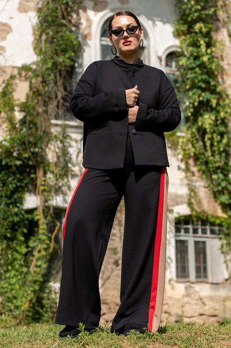 Костюм женский брючный состоящий из жакет на подкладке и брюк. Соременный жакет на подкладке из премиум трикотажа, с центральной бортовой застёжкой на петли и пуговицы. Горловина круглой формы. рукава притачные с отложными манжетами. На полочке в горизонтальном подрезе обработаны карманы. По низу спинки обработана кулиса с эластичной резинкой,сосредним швом. Брюки женские прямого кроя, на притачном поясе по переду и с резинкой по спинке. Передние половинки с карманами в швах. Брюки по боковым швам со вставкой из конрастной ткани. По передней вставке пояса обработа ны шлёвки и декоративная подвеска.