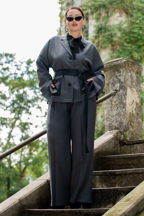 Костюм жакет и брюки из   костюмной ткани. Безусловная класика современая и всегда привлекает взгляды. Жакет прямого кроя со съёмным поясом,воротник пиджачного типа. Жакет с центральной бортовой застёжкой на три петли и три пуговицы. На полочках обработаны накладные карманы из экокожи. По боковым швам обработаны разрезы и шлёвки под съёмный пояс из экокожи. Брюки женские прямого   силуэта, современная класическа, по переду пояс   со шлёвками, и застёжка на тесьму-молнию и пуговицу, по спинке пояс с эластичной резинкой. Брюки с боковыми наклонными карманами. Брюки со складками по переду.