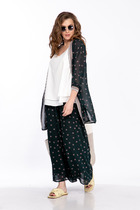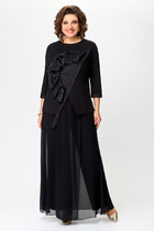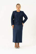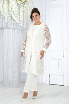 Комплект женский состоит из жакета и юбки. Элегантный женский жакет без подкладки с воротником пиджачного типа и застежкой на 3-и петли и пуговицы. По левой части переда накладной карман с декоративной нашивкой. Рукав втачной двухшовный со шлицей по низу и петлями с пуговицами. Юбка А-образного силуэта  со складками по переду, в боковых швах карманы. Юбка на подкладке.  Для максимально комфортной посадки по бокам пояса вставлена эластичная резинка. Длина жакета 49 см, длина рукава 60 см, длина юбки 85 см.