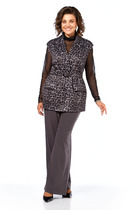 Трикотажный женский костюм из структурной ткани. Жакет прямого силуэта переду центральная застежка на 3-и петли и пуговицы и потайные кнопки. По переду накладные карманы декорированные цепью и застежкой на петлю и пуговицу. Спинка со средним швом без особенностей. Рукава втачные двухшовные. Юбка прямая длиной миди без подкладки. По правому боковому шву разрез. Для максимально комфортной посадки по поясу эластичная резинка.
