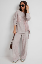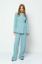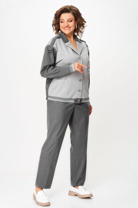 Костюм в стиле спорт-шик сочетающий в себе женственность и комфорт. Сочетание двух тканей трикотажного полотна и костюмной ткани добавляет оригинальность. Жакет со спущеным плечем и декорирован печатью по левой части переда, воротник пиджачного типа. По пинии плеча паты с полукольцом. Рукав втачной одношовный с манжетой по низу. Спинка с кокеткой и отлетной планкой. Понизу довяз и регулируемая кулиса. Брюки, слегка зауженные к низу, свободного силуэта. По переду вблизи боковых швов карманы. Для максимально комфортной посадки по поясу вставлена эластичная резинка.