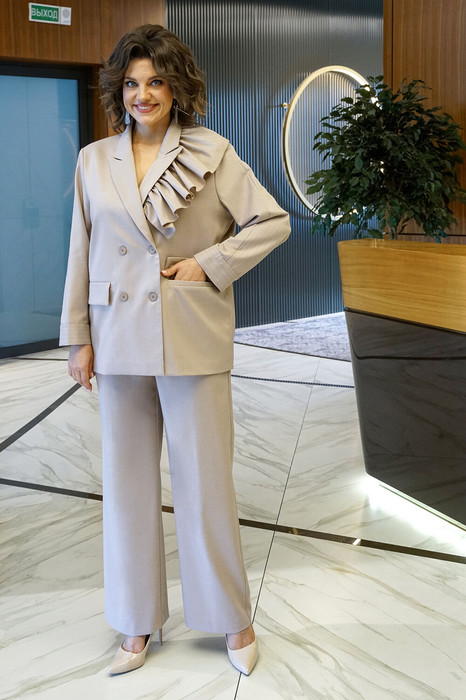 Брюки широкие, свободного прямого силуэта, на притачной поясе. Застёжка на тесьму-молнию в среднем шве переда и петлю и пуговицу по поясу. Передние части с талевой выточкой и косыми боковыми карманами. Задние части с талевой выточкой