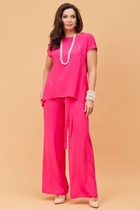 Брюки прямого, свободного силуэта, с притачным поясом со шлёвками, по боковым на резинке, с застёжкой типа «гульфик» на молнию и по краю пояса на пробивную петлю и пуговицу. С переходящими боковыми швами на перед с закрытым срезом на лица. Передние части с фигурными боковыми карманами. Задние части с кокеткой и накладными карманами. По низу имитация цельнокроеной манжеты.
