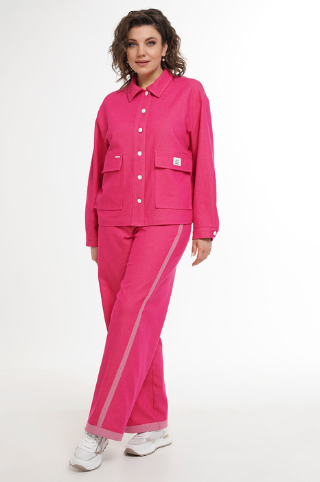 Жакет прямого силуэта, со спущенной линией плеча, с застёжкой по притачной планке на пробивные петли и пуговицы. Перед с накладными карманами с клапаном, клапаны декорированы пришивными нашивками. Спинка со средним швом, чуть ниже линии талии кулиса и завязка фиксируемая степень прилегания. Рукава втачные, двухшовные, понизу с разрезом, мягкой складкой и притачными манжетами на пробивную петлю и пуговицу. Воротник отложной.
