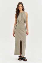 Юбка-брюки прямого силуэта, с притачным поясом на резинке: юбка по переду с мягкой складкой смещённой влево, по левому боковому с разрезом, декорированный отделочной тесьмой, правый боковой отлетной, брюки по боковым швам с разрезами (выполнены из трик. полотна).
