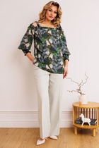 Блузон прямого свободного силуэта, понизу с притачным поясом, двухслойный: нижняя часть (выполнена из трик. полотна) без рукавов, верхняя часть с небольшим напуском понизу, с углубленной проймой и мягкими складками по центру горловины. Рукава, втачные расширенные понизу декорированы отделочной тесьмой.