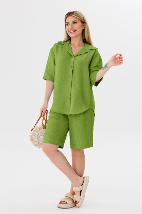 Рубашка свободного силуэта, с центральной бортовой застежкой на петли пуговицы. Воротник на стойке отложной. Спинка на кокетке, рукав короткий.