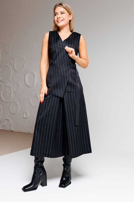 Костюм двухпредметный, состоящий из элегантного женского жилета, полуприлегающего силуэта с застежкой на декоративную тесьму, полукольцо и потайную пуговицу. Жилет на подкладке.