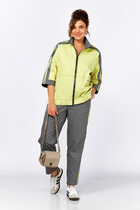 Жакет свободного силуэта с застежкой по переду на кнопки. Воротник отложной. По переду отрезные кокетки, накладные карманы с клапанами. По спинке кокетка и рельефы. Рукав двухшовный с притачной манжетой на кнопках. Низ жакета на притачном поясе.