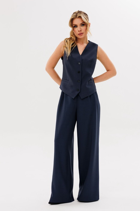 Жилет полуприлегающего силуэта, на подкладке. По переду рельефа карманы "листочки", застёжка на петли-пуговицы. По спинке вытачки.