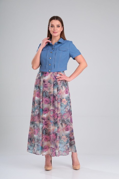 Комплект состоит из сарафана и жакета. В сарафане в боковом шве молния, а также молния по центру груди декоративная металлическая. Юбка сарафана из цветного шифона на подкладке. Жакет укороченный на пуговицах, рукав на манжете с застёжкой на пуговицу.