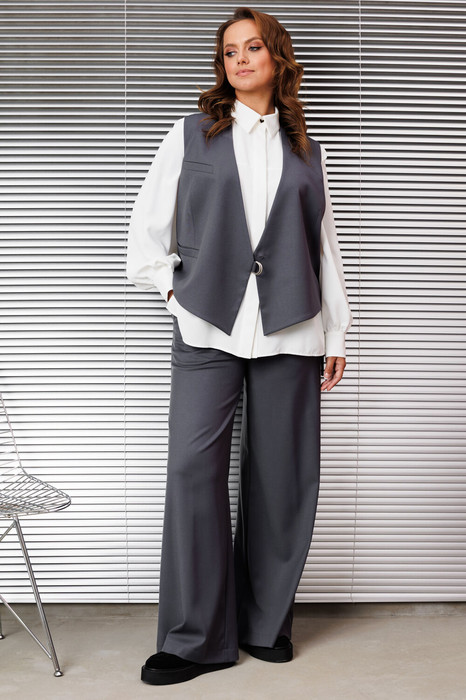 Женский брючный костюм тройка, состоящий из жилета, брюк и рубашки.  Изысканный жилет полуприлегающего силуэта, он полностью на подкладке, что обеспечивает идеальную посадку и комфорт, дополнен застежкой на декоративную тесьму и потайную пуговицу. На правой полочке обработан нагрудный карман листочка и функциональный карман листочка в области талии, по горловине прилегающий воротник стойка. Спинка со средним швом и выточками. Брюки свободного прямого кроя со средней посадкой. В боковых швах функциональные карманы с отрезным бочком. Верхний срез оформлен поясом с эластичной тесьмой. Блузка прямого силуэта идеально сочетает в себе комфорт и стиль. В блузке классический рубашечный воротник и удобная центральная застежка на потайной планке на петли и пуговицы. Рукава втачные со сборкой по низу что обеспечивает эффектный объемный вид, по низу обработан притачной манжет застегивающийся на петлю и пуговицу. По полочке в области груди подрез. По спинке кокетка, переходящая на полочку и бантовая складка от кокетки. В боковых швах по низу обработаны разрезы