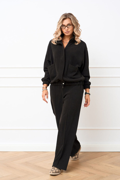 Костюм из трикотажной ткани в рубчик под штрукс, состоящий из джемпера и брюк. Джемпер прямого силуэта, по полочке обработана кокетка и в области талии накладные карманы с асимметричным краем, застежка центральная на тесьму молнию закрытая ветрозащитной планкой фиксирующаяся кнопками. Воротник стойка. Низ изделия на притачном поясе с эластичной тесьмой. Линия плеча слегка спущена, рукав втачной по низу притачная манжета с эластичной тесьмой. Брюки прямого силуэта, в боковых швах обработаны карманы. Верхний срез обработан притачным поясом по задним половинкам для лучшей посадки вставлена резинка, застегивающийся на петлю и пуговицу, застёжка центральна с гульфиком и откоском на тесьму