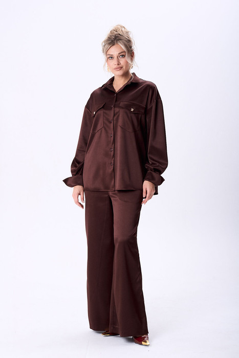 Костюм женский из вискозной ткани с сатиновым блеском свободного силуэта что обеспечит комфорт и идеальную посадку. Рубашка полуприлегающего силуэта со спущенной линией плеча, с центральной застежкой на петли и пуговицы, воротник рубашечный. На полочке в области груди настрочены накладные карманы и клапаны, которые фиксируются на петлю и пуговицу. Рукав длинный по низу притачная манжета, застегивающаяся на петлю и пуговицу. По спинке обработана двойная кокетка, для более комфортной посадки спинка присборена по шву притачивания кокетки.