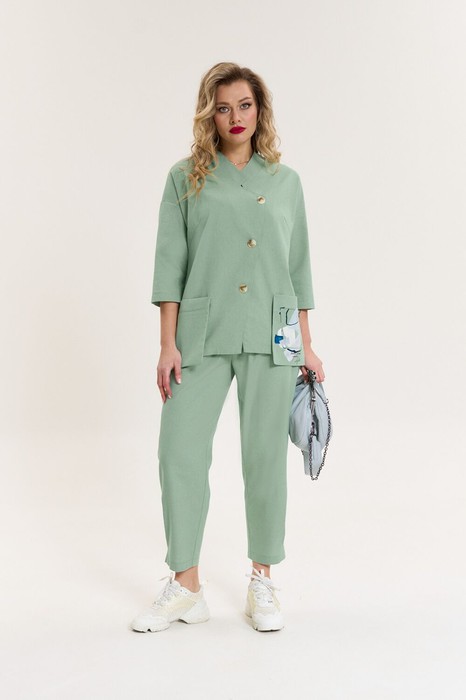 Женский брючный костюм — это идеальное сочетание стиля, комфорта и универсальности, которое станет вашим верным спутником как на деловых встречах, так и при повседневной носке. Изготовленный из высококачественной ткани, этот костюм обеспечивает легкость и приятные ощущения при носке. Костюм женский 2-хпредметный (жакет и брюки). Жакет из текстильной ткани прямого силуэта со спущенным плечом. По полочке идут грудовые выточки из бокового шва. Застежка ассиметричная. Воротник стойка. По спинке встречная складка. Рукав 3/4. По полочке идут отлетные накладные карманы с декором (термонаклейка). Брюки прямые, зауженные к низу за счет защипов. Пояс на резинке, по бокам карманы. Длина спинке:(48-52)-70см, (54-58)- 73см. Длина рукава:(48-58)-33см. Длина брюк (48-50) -93см, (52-58)-95см