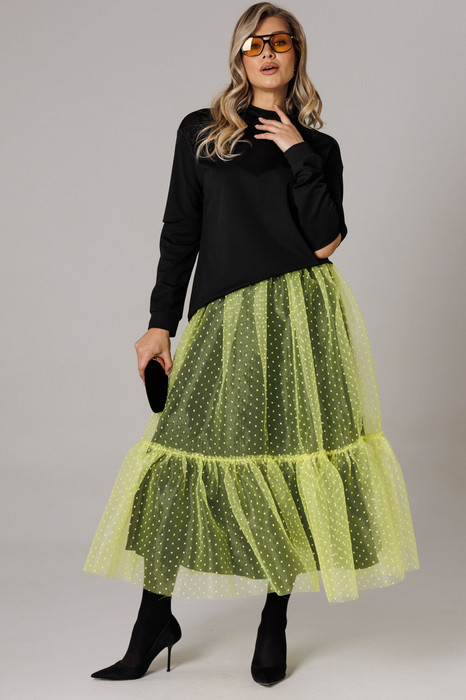 Оригинальный  женский комплект от бренда Anastasia, идеальный для любого случая. Этот костюм сочетает в себе элегантность и комфорт, что делает его подходящим как для повседневной носки, так и для праздничных мероприятий. Джемпер  оверсайз из трикотажного полотна. Прямого силуэта со спущенным плечом.  Воротник-стойка. По рукаву идет подрез с разрезом. Низ рукава и низ джемпера - на манжете. Джемпер лекго сочетается с любыми низами: брюки, джинсы, юбка.  Юбка макси из 2-х видов ткани: верх с отрезным валаном из органзы, подкладка юбка солце из шифона.  Пояс на декоративной резинке. Фасон универсален, а использование резинки на поясе повышает комфортность носки, позволяя юбке адаптироваться под индивидуальные особенности фигуры. Юбку легко сочетать с различными верхами: топ, блузка, футболка, кружевной жакет, свитер или жакет из тексиля - все это позволит создавать различные образы на разные случаи. Длина по спинке  68см. Длина рукава (с манжетой): 60см. Длина юбки:  90 см
